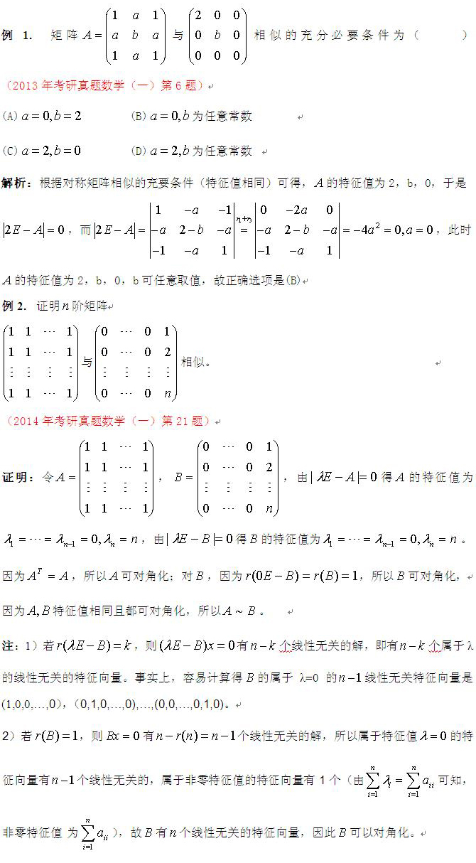 在 考研数学中,特征值和特征向量是线性代数的重要考点之一,每年必考,并且往往是以一道解答题的形式出现,占11分,因此各位考生应该重视并熟练掌握其解题方法。在 《2015考研数学线性代数典型题型分析:特征值和特征向量(1)》中,已经向大家介绍了求矩阵的特征值和特征向量的不同方法,下面 文都考研数学辅导老师将向大家继续介绍判断或证明矩阵可对角化的不同方法、将矩阵相似对角化的不同方法以及相似矩阵的一些性质,供各位考生参考,希望对大家有所帮助。