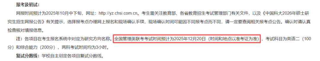 中国科学技术大学2026级MBA招生通知显示今年研究生初试时间预计为12月20日-21日(部分科目22日考)